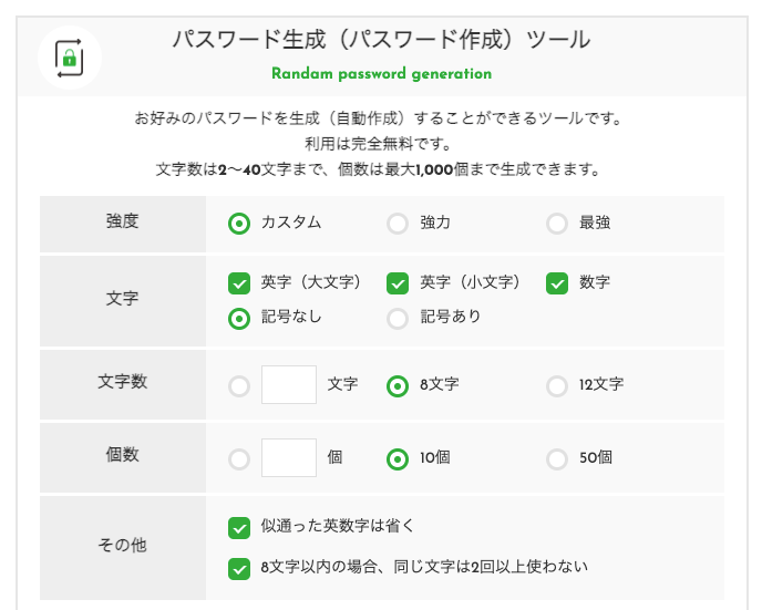 文字数は2~40文字まで、個数は最大1,000個まで生成できます。