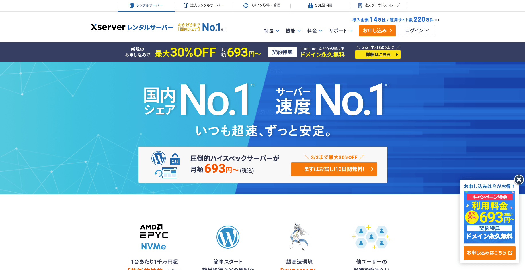 2022年3月1日現在の情報では、エックスサーバーご契約でドメインが0円!サーバーご利用中は更新も0円!とあります。