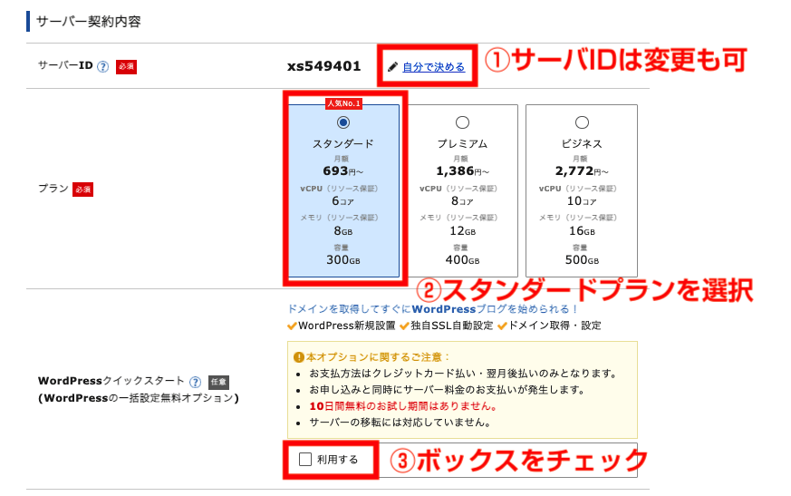 こちらの画面で、サーバーの契約内容を決めていきます。