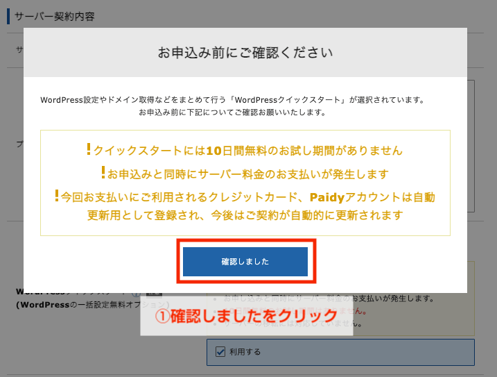 ※WordPressクイックスタートを選択すると、下記の注意事項がありますので、