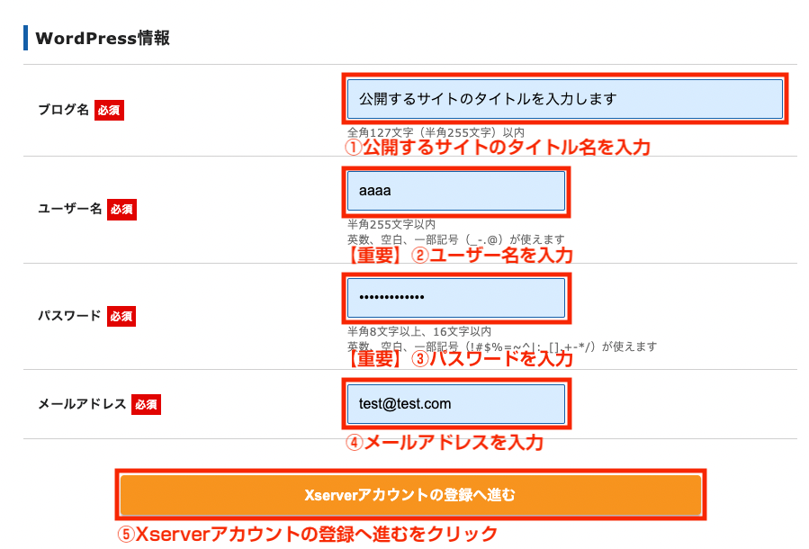 WordPress情報の「ブログ名」「ユーザー名」「パスワード」「メールアドレス」入力します。