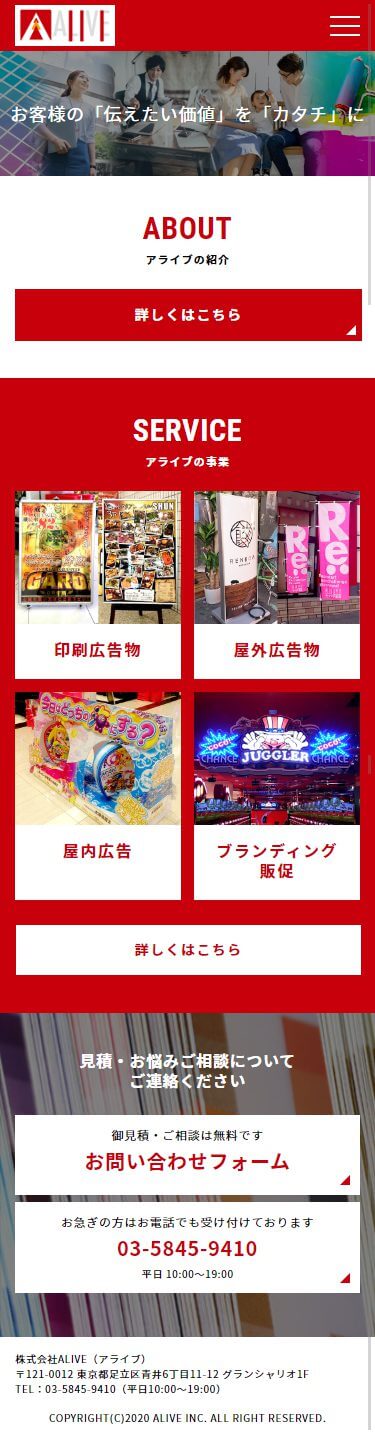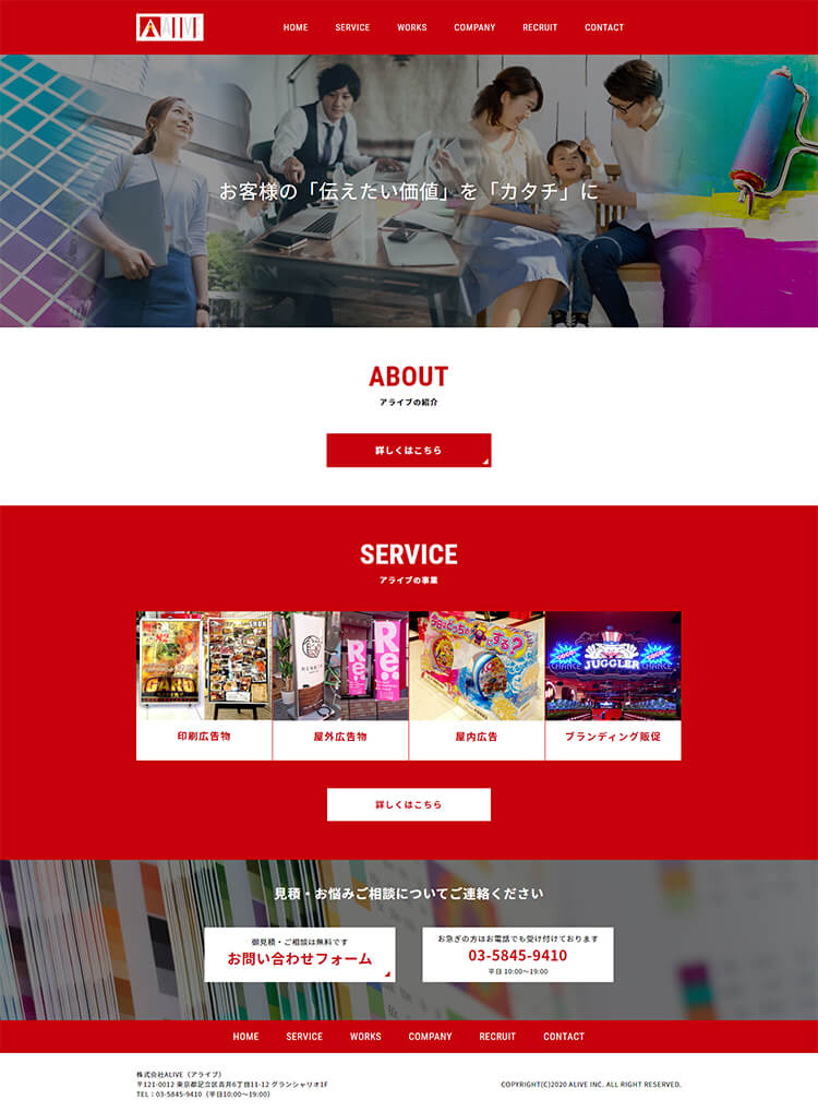 ショッピングモール・アミューズメント施設飲食業・医療関係・美容関係のデザイン及び製作を行う、株式会社ALIVEさまのコーポレートサイトをWordPressにて制作いたしました。